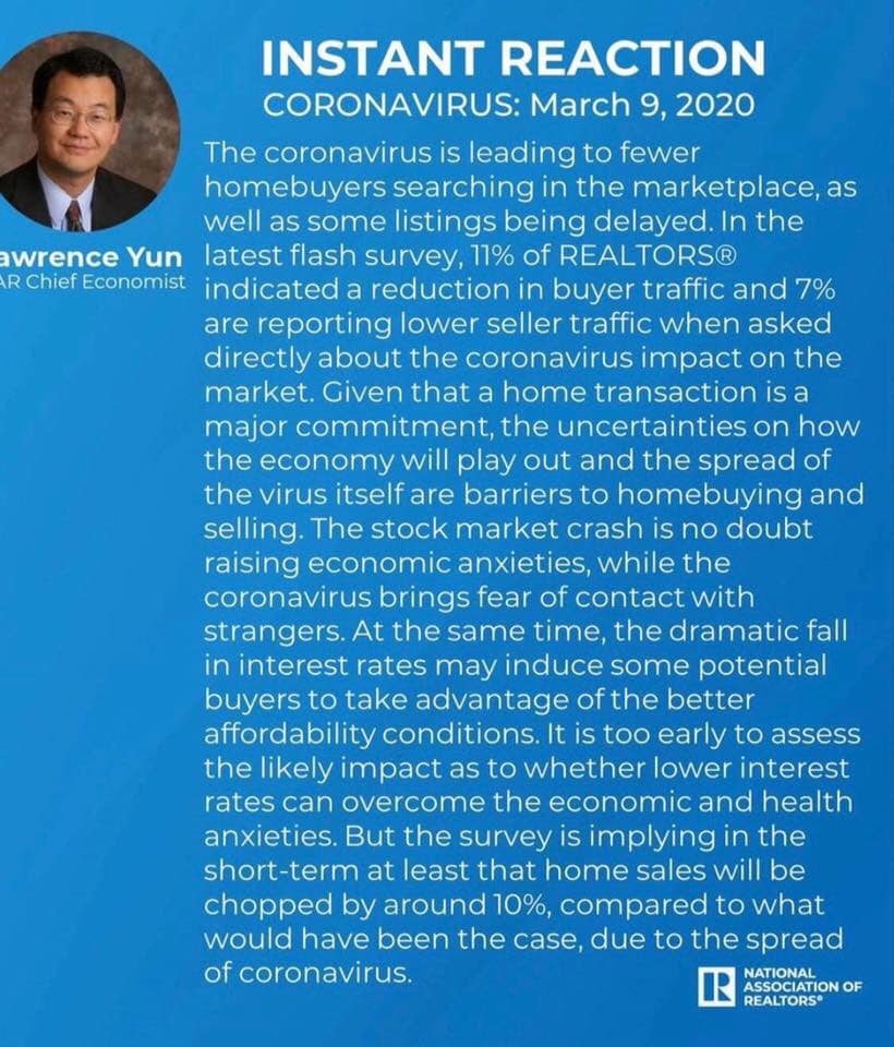 I think as we are heading towards a global recession and the continuing daily life impacts of the virus, we are going to see a slowing down of the real estate market in general. Uncertainty is the hobgoblin of the home buyer. Indeed, this is exactly what Lawrence Yun, Chief Economist at the National Assoc. of Realtors is saying: