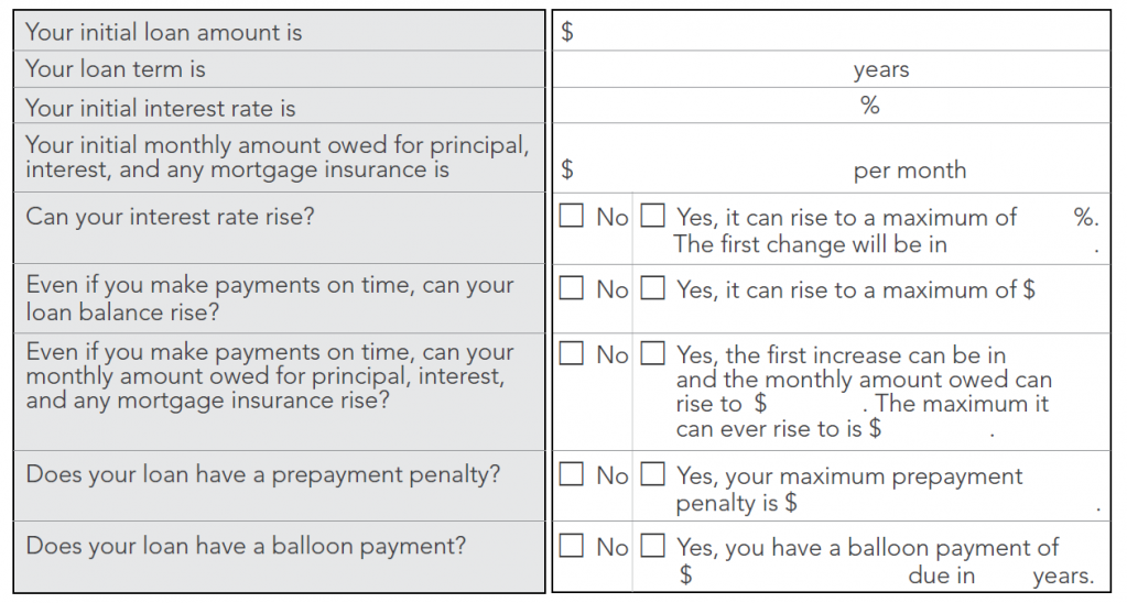 Borrowers must receive a standard GFE disclosing key loan terms, including the loan’s terms; whether the interest rate is fixed or otherwise; any prepayment penalties and/or balloon payments; and total closing costs.